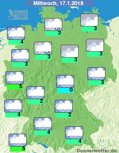 Am Mittwoch zieht überwiegend starke, hier und da auch mal etwas aufgelockerte Bewölkung über das Bundesgebiet hinweg, dabei bilden sich zeitweise Schnee-, Schneeregen- oder Graupelschauer. Die Temperatur steigt auf nur noch auf 0 Grad im Grabfeld und bis 5 Grad im Rheinland.