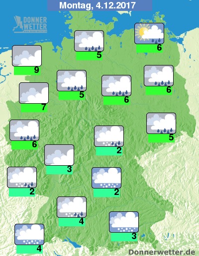 Am Montag bleibt es bei überwiegend dichten Wolken, Auflockerungen sind vor allem an der Ostsee, hier und da auch im Westen und Nordwesten möglich, hier bleibt es auch die meiste Zeit über trocken, sonst fällt dagegen zeitweise Regen, nach Süden hin meist Schneeregen oder Schnee. Die Temperatur erreicht 2 Grad in Mittelfranken und bis 9 Grad in Wilhelmshaven.