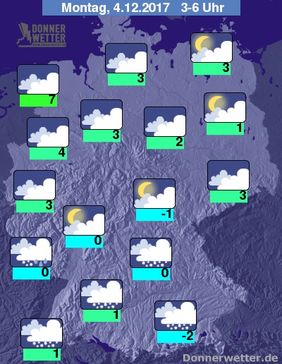 In der folgenden Nacht fällt im Süden bei dichten Wolken verbreitet Schnee oder Schneeregen, dazu ist es häufig sehr glatt! Weiter nach Norden hin halten sich zwar meist dichte Wolken, Regen oder Schnee fällt dazu jedoch nur selten. Die Temperatur sinkt auf 7 Grad an der Nordsee und bis -2 Grad am Alpenrand.