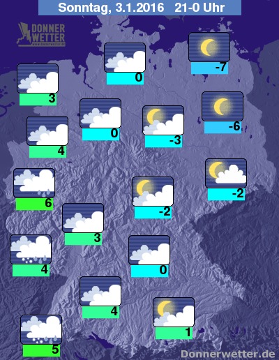 Heute Abend zeigt sich der Himmel vom Nordosten bis in den Osten hinein verbreitet sternenklar. Im äußeren Westen und Südwesten fällt bei dichten Wolken zeitweise Regen oder Schneeregen, er breitet sich bis Mitternacht etwa zu einer Linie vom  Niederrhein bis ins östliche Baden-Württemberg aus. Nordöstlich davon ist es zwar meist stark oder dicht bewölkt, jedoch trocken. Die Abendtemperatur liegt bei 6 Grad in Aachen und frostigen -7 Grad in Neubrandenburg. Im Norden und Westen weht teils starker, an der Nordsee und auch den Bergen oft stürmischer Wind, dabei sind auch schwere Sturmböen möglich.