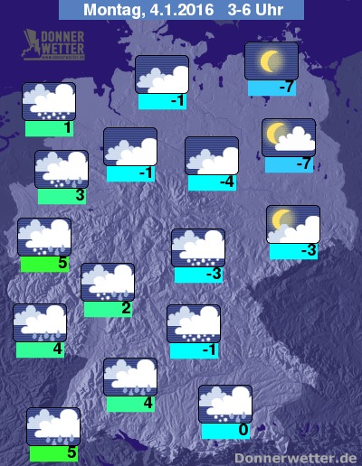 In der Nacht zum Montag verlagert sich das Niederschlagsgebiet weiter nach Nordosten und erreicht bis zum Morgen etwa eine Linie von der Wesermündung bis zum östlichen Erzgebirge, dabei fällt im Süden und Westen meist Regen oder Schneeregen, weiter nach Osten und Norden fällt hingegen überwiegend Schnee und es besteht erhebliche Glättegefahr! Im Nordosten bleibt es weitgehend sternenklar oder locker bewölkt und dabei trocken. Die Temperatur sinkt auf 5 Grad in Bonn und auf eisige -7 Grad in Berlin. Im Norden weht ein teils starker, an der Nordsee und auch den Bergen oft stürmischer Wind, dabei sind schwere Sturmböen möglich.