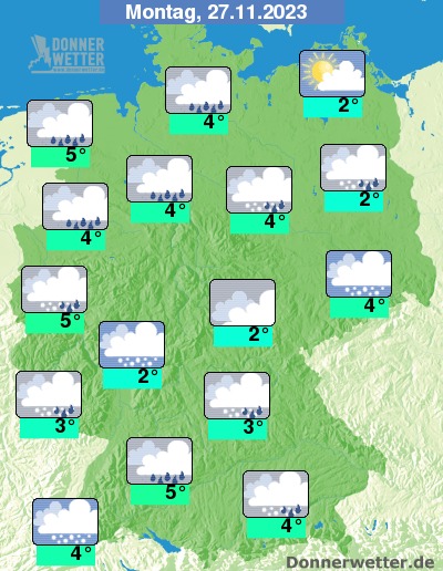 Am Montag zeigt sich der Himmel über dem äußersten Nordosten heiter oder es ist sonnig, dabei bleibt es meist trocken. In den übrigen Landesteilen ist es weiterhin stark bewölkt oder bedeckt und immer wieder muss mit Schauern gerechnet werden, die teils als Regen oder Schneeregen, ab 300 bis 500 m auch als Schnee fallen können.