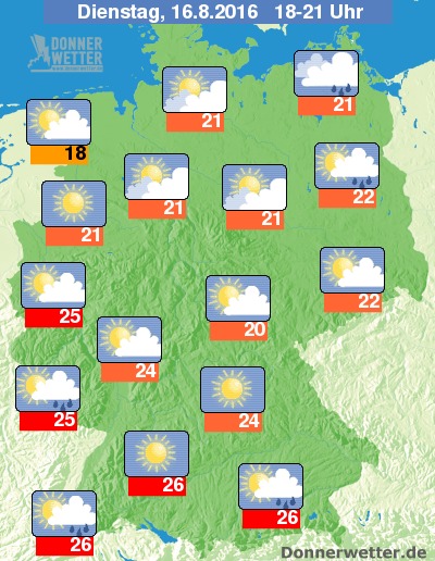 Heute Abend sind im äußeren Süden Deutschlands gebietsweise Schauer und auch teils kräftige Gewitter möglich. Ebenfalls einzelne Schauer bilden sich über dem Nordosten des Landes und über Berlin-Brandenburg. Im übrigen Bundesgebiet ist es verbreitet heiter bis sonnig und nur selten ziehen auch mal mehr Wolken durch, dabei bleibt es trocken. Die Temperatur liegt bei 18 Grad in Emden und 26 Grad am Bodensee.