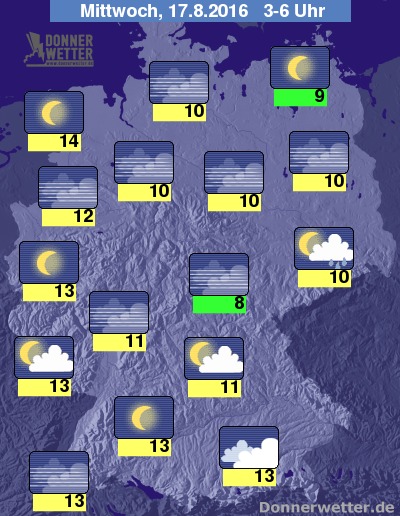 In der Nacht zum Mittwoch ziehen am Alpenrand hier und da dichte Wolken durch, dabei sind einzelne Schauer und Gewitter möglich. Auch am Erzgebirge kann es vereinzelt schauern. Im großen Rest der Republik ist der Himmel hingegen meist sternenklar, im Südwesten auch oft locker bewölkt und es bleibt trocken. Die Temperatur sinkt auf 13 Grad in Saarbrücken und etwa 8 Grad im Thüringer Becken.