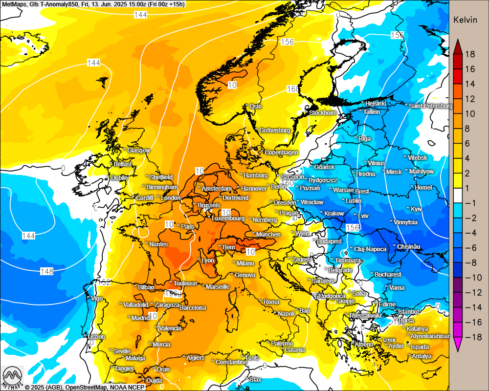 Die Karte zeigt die Temperaturanomalie (13.06.2025, 15 Uhr) nach GFS.