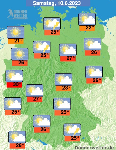 Am Samstag ist es überwiegend heiter bis sonnig, gebietsweise ziehen allerdings auch einige Wolken auf. Es besteht aber nur ein leichtes Schauer- und Gewitterrisiko, zum Großteil bleibt es trocken. Die Temperatur erreicht 21 Grad in Wilhelmshaven und bis 30 Grad in Köln.