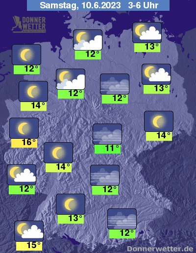 In der kommenden Nacht zeigt sich der Himmel über dem Land meist sternenklar. Einige, meist lockere Wolkenfelder sind vor allem im Norden, aber auch im Nordosten und Südwesten möglich, dazu bleibt es trocken. Die Temperatur sinkt auf 16 Grad in Bonn und 11 Grad in Jena.