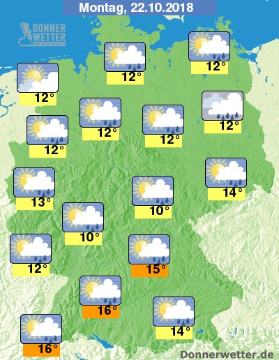 Am Montag ist es überwiegend wechselnd bis stark bewölkt, von Nordwesten zieht allerdings eine Kaltfront mit vorübergehend kompakten Wolken und dazu leichtem Regen übers Land hinweg, vor und nach der Front ist es dagegen meist trocken. Die Temperatur steigt nur noch auf 10 Grad im Thüringer Becken und bis 16 Grad in Stuttgart.