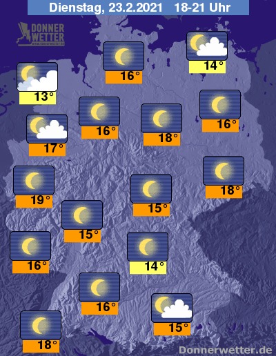 Heute Abend zeigt sich der Himmel über dem Land verbreitet sternenklar. Im Küstenumfeld von Nord- und Ostsee ist es aber auch oft stark bewölkt, es bleibt aber überall trocken. Die Temperatur liegt noch bei 13 Grad in Cuxhaven und bis 19 Grad in Köln.
