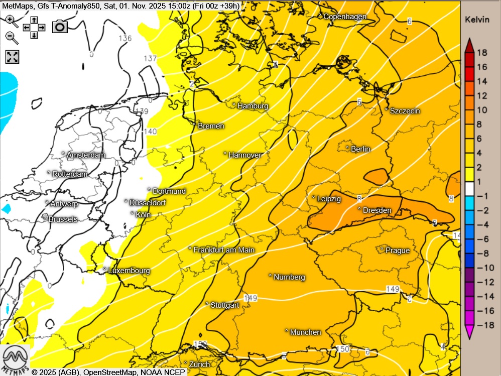 Die Wetter- und Temperaturkarte sowie die Temperaturabweichung für Samstagnachmittag (15:00 Uhr) nach GFS: