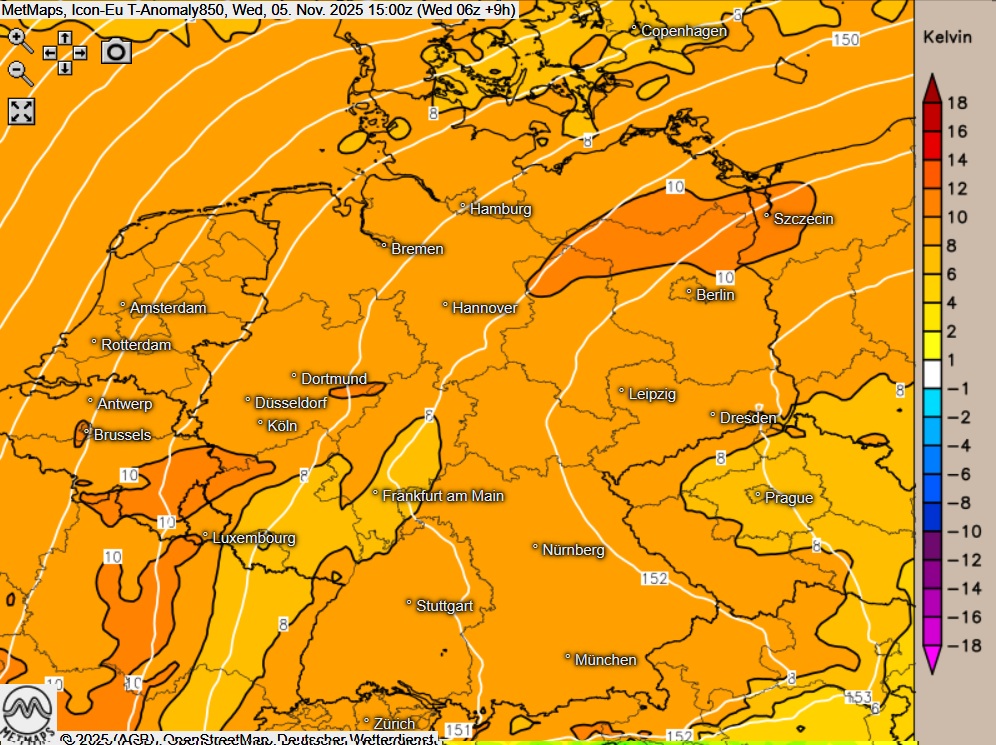 Die Lufttemperaturen sowie die Temperaturabweichung am Mittwochnachmittag (15:00 Uhr) nach Icon-Eu: