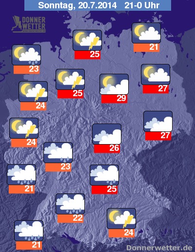 Am Abend breiten sich Schauer und Gewitter weiter nach Osten aus und erreichen in etwa die Mitte Deutschlands, weiter nach Osten bleibt es bei wechselnder bis starker Bewölkung weitgehend trocken. Die Temperaturen liegen bei vielfach tropischen Werten zwischen 29 Grad in Magdeburg und 21 Grad am Pfälzer Wald.