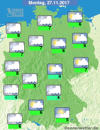 Zum Wochenstart erwartet uns verbreitet nasskaltes und dunkelgraues Novemberwetter. Etwas Sonnenschein ist anfangs im Süden und Osten möglich, aber auch hier werden die Wolken dichter und es regnet zum Teil langanhaltend. Teils ist auch Schnee mit dabei. Es werden 4 bis 8 Grad erreicht.