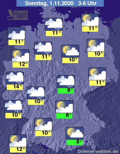 In der folgenden Nacht ist es zunächst vor allem über der Südosthälfte noch verbreitet sternenklar oder locker bewölkt. Dagegen ziehen von Nordwesten her kompakte Wolken auf, die zunächst im Nordwesten, später über der gesamten Nordwesthälfte auch Regen bringen. Im Süden und Osten nimmt die Bewölkung zwar weiterhin zu, aber bis zum Morgen bleibt es hier noch weitgehend trocken. Die Temperatur sinkt auf 14 Grad im Rheinland und bis 8 Grad im Grabfeld.