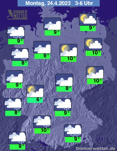 Am Montag zieht wechselnde, überwiegend allerdings starke Bewölkung durch, dabei bilden sich gebietsweise Schauer, ganz vereinzelt sind auch Gewitter möglich. Die Temperatur steigt auf sehr frische 9 Grad an der Nordsee und bis 16 Grad in der Lausitz.