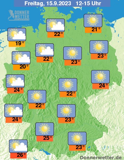 Heute Nachmittag scheint die Sonne von einem oft wolkenfreien Himmel. Bei Temperaturen von 19 Grad im nördlichen Emsland und 26 Grad im Breisgau bleibt es überall trocken.