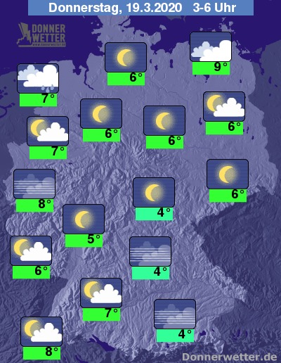 In der Nacht zum Donnerstag fällt im Norden unter oft dichten Wolken gebietsweise Regen. Vom Süden Deutschlands bis in die breite Mitte zeigt sich der Himmel hingegen überwiegend sternenklar und sonst locker bis aufgelockert bewölkt, dazu bleibt es trocken. Die Temperatur sinkt auf 8 Grad am Rhein und bis 4 Grad in Mittelfranken.