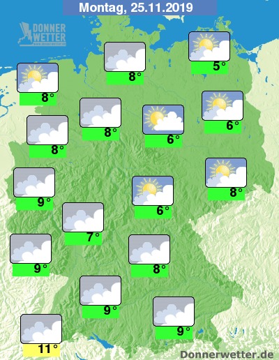 Zum Start in die neue Woche präsentiert sich das Wetter über dem Land verbreitet trüb oder stark bewölkt, nur mit etwas Glück lässt sich zwischendrin mal die Sonne blicken. Es bleibt trocken bei Höchstwerten von 5 Grad an der Müritz und bis zu 11 Grad im Oberrheingraben.