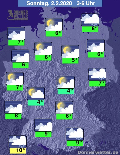 In der kommenden Nacht lockert die Bewölkung hin und wieder auf, gebietsweise bringen dichte Wolken aber auch Regen. Die Temperatur sinkt auf 10 Grad im Oberrheingraben und bis 4 Grad im Vogtland. Vor allem über der Nordhälfte des Landes weht ein teils starker bis stürmischer Wind, an den Küsten herrscht häufig auch Sturm.