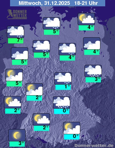 Heute Abend erstreckt sich ein Niederschlagsgebiet vom Norden bis in den Osten und in die Nordosthälfte Bayerns hinein, dabei fällt unter dichten Wolken zeitweise Schnee oder Schneeregen, im Norden durchweg Regen. In den übrigen Landesteilen ist es auch meist stark, teils auch locker bis aufgelockert bewölkt und es bleibt meist trocken. Die Temperatur liegt bei 0 Grad in Nürnberg und bis 7 Grad in Wilhelmshaven.