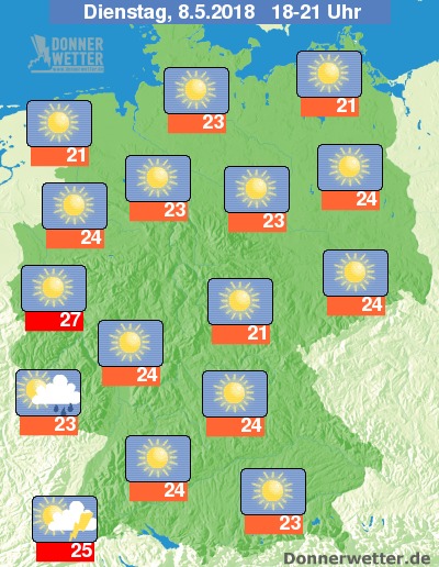 Heute Abend ziehen im Südwesten hier und da dichte Quellwolken auf, die hier auch gebietsweise Schauer oder Gewitter bringen, sonst bleibt es jedoch weiterhin sonnig und trocken. Die Temperatur liegt bei etwa 21 Grad an den Küsten von Nord- und Ostsee und bis 27 Grad in der Kölner Bucht.