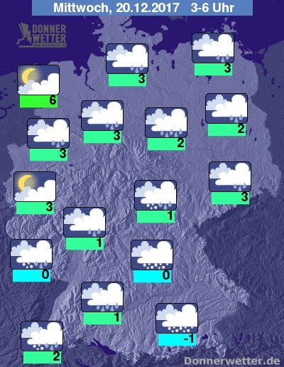 In der Nacht zum Mittwoch bleibt es fast landesweit bedeckt, westlich des Rheins lockert der Himmel vielerorts auf, hier bleibt es auch meist trocken, sonst fällt über der Südhälfte jedoch immer wieder Regen, Schneeregen oder Schnee, im Norden meist nur Regen. Die Temperatur sinkt auf 6 Grad in Cuxhaven und bis -1 Grad im Alpenvorland.