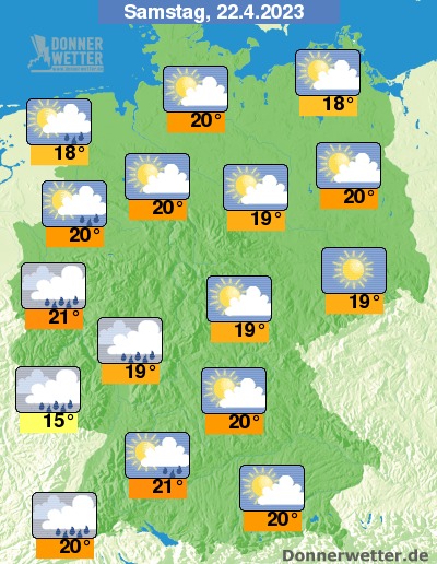 Am Samstag zeigt sich das Wetter über der Osthälfte noch meist heiter und dazu trocken, ansonsten nimmt die Bewölkung von Westen her jedoch immer weiter zu und am Nachmittag sind dann auch Schauer, selten auch Gewitter möglich. Die Temperatur steigt auf teils nur 15 Grad am Pfälzer Wald und bis 21 Grad in der Kölner Bucht.