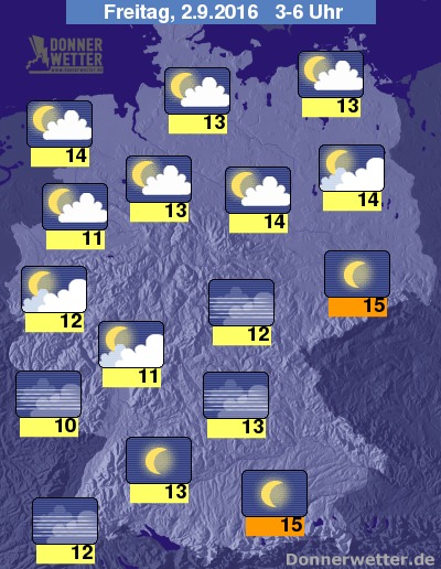 In der kommenden Nacht ist der Himmel vor allem im Süden und Osten der Republik häufig sternenklar, sonst zieht meist lockere, vor allem zum Morgen hin oft auch aufgelockerte Bewölkung durch. Es bleibt trocken bei Tiefstwerten von 15 Grad in Hoyerswerda und etwa 10 Grad im Saargau.