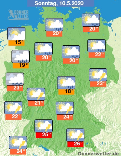 Zum heutigen Muttertag zeigt sich das Wetter überwiegend stark, zum Teil auch aufgelockert bewölkt, dabei bilden sich gebietsweise Schauer, über der Südhälfte und im Osten entwickeln sich auch örtliche Gewitter. Die Temperatur steigt auf frische 15 Grad an der Nordsee und auf teils schwülwarme 26 Grad in München.