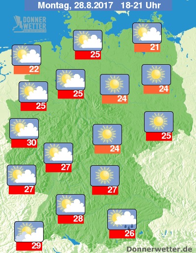 Heute Abend können sich am Alpenrand örtlich Schauer oder Gewitter entwickeln. Im großen Rest der Republik ist es aber verbreitet heiter, vor allem über der Osthälfte zumeist soagar sonnig, dazu bleibt es trocken. Die Temperatur liegt bei 21 Grad in Stralsund und bis 30 Grad in Köln.