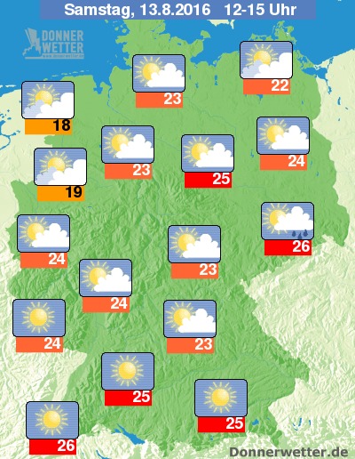 Heute Nachmittag ziehen vor allem nach Nordwesten hin oft viele und zum Teil auch dichte Wolken durch, dazu bleibt es aber meist trocken, am Erzgebirge sind bei teils dichten Wolken vereinzelte Schauer möglich. Im Süden des Landes ist es hingegen verbreitet sonnig und trocken. In den übrigen Landesteilen ist es größtenteils heiter, zum Teil ebenfalls sonnig und dazu auch trocken. Die Temperatur steigt auf 18 Grad in Emden und bis 26 Grad in Freiburg.