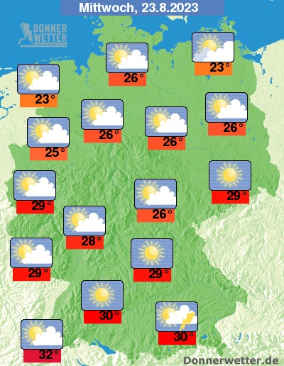 Die Temperaturen erreichen Höchstwerte um 23 Grad an den Küsten und 32 Grad am Oberrhein.