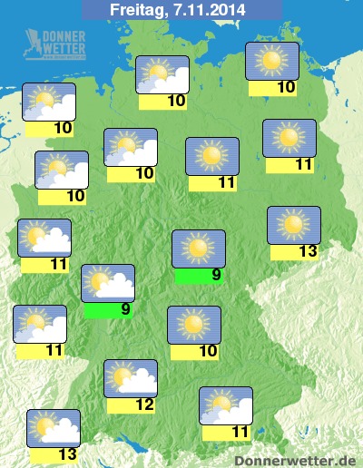 Am Freitag können wir uns fast landesweit auf einen ruhigen und freundlichen Herbsttag freuen, dabei halten sich im Südosten jedoch noch teils längere Zeit dichte Wolken, sonst zeigt sich aber verbreitet die Sonne zwischen meist lockeren Wolkenfeldern. Gebietsweise wird es auch wolkenlos, dazu bleibt es trocken. Die Temperatur steigt auf, für die Jahreszeit milde Werte zwischen 9 Grad am Spessart und etwa 13 Grad im Oberrheingraben.