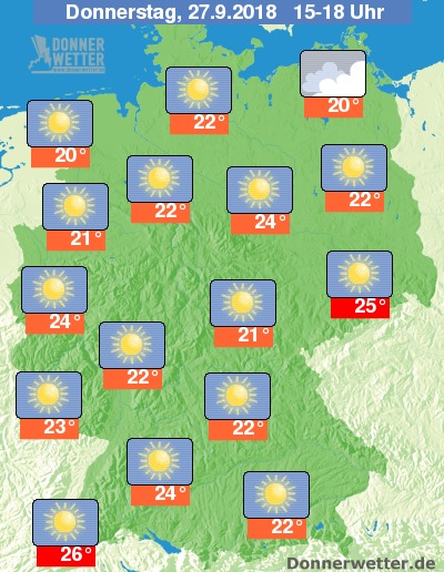 Am frühen Nachmittag strahlt verbreitet die Sonne von einem wolkenlosen oder nur leicht bewölkten Himmel. Lediglich in Teilen von Schleswig-Holstein, im Küstenbereich der Ostsee, sowie in der Uckermark halten sich dichtere Wolken, Regen fällt aber voraussichtlich nicht. Direkt an der Küste bleibt es mit 19 Grad auch am kühlsten, sonst werden jedoch angenehme 20 bis 24, im Breisgau auch 25 Grad erreicht.