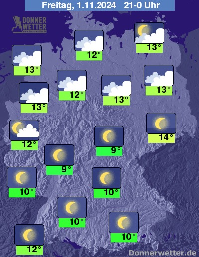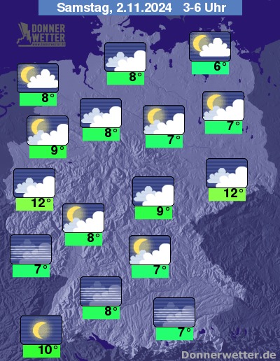 In der Nacht zum Samstag ist der Himmel über dem Norden stark bewölkt oder bedeckt und es muss weiterhin mit vereinzeltem Sprühregen gerechnet werden. Im Nachtverlauf sind hier dann auch größere Auflockerungen möglich. In den übrigen Landesteilen ist der Himmel zunächst klar oder nur gering bewölkt, später bildet sich dann erneut verbeitet Nebel oder Hochnebel.