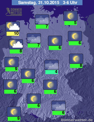 In der bevorstehenden Nacht halten sich vor allem über dem Norden und Westen noch oft dichte Wolken, sonst ist es meist locker bewölkt oder schon sternenklar. Im weiteren Nachtverlauf klart der Himmel aber über dem Bundesgebiet verbreitet auf, vor allem nach Nordwesten hin halten sich jedoch meist lockere Wolken. Es bleibt landesweit trocken. Die Tiefstwerte liegen bei 10 Grad an der Nordsee und 4 Grad im Grabfeld. Stellenweise bildet sich wieder Nebel oder Hochnebel.