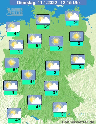 Heute Nachmittag ist es oft stark bewölkt oder trüb, vielerorts zeigen sich aber auch Auflockerungen, dabei bleibt es landesweit trocken. Die Temperatur erreicht 2 Grad in Berlin und bis 6 Grad in Köln.
