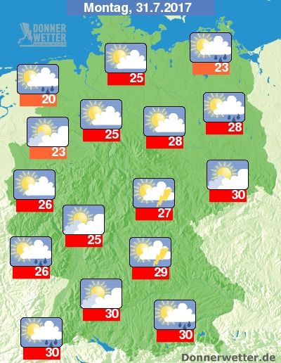 Im Nordwesten wechseln sich bei angenehmen 20 bis 27 Grad kurze freundliche Abschnitte mit dichteren Wolken ab. In der Südosthälfte strahlt für längere Zeit die Sonne und heizt die Luft auf schweißtreibende 27 bis 34 Grad auf. Direkt dazwischen können sich diagonal über Deutschland örtlich kräftige gewittrige Regengüsse mit Gefahr von Platzregen und Hagel entwickeln. Stelleweise kann es auch wieder zu kleinräumigen Überschwemmungen kommen.