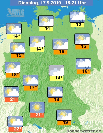 Vor Beginn der Dämmerung bewegen sich die Temperaturen noch zwischen 12 Grad auf Rügen und 22 Grad im Markgräflerland.