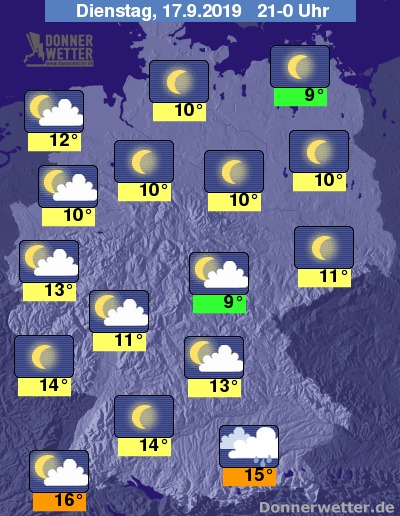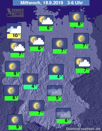 Bis zu den Frühstunden kühlt die Luft auf teils sehr frische 3 bis 9 Grad ab. Nur im Küstenbereich der Nordsee halten sich die Temperaturen noch meist im zweistelligen Bereich auf.