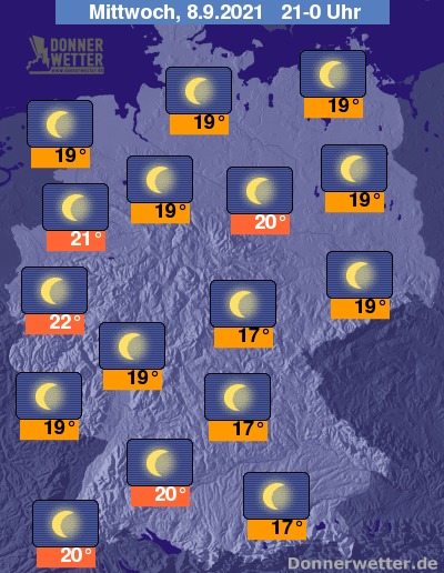 Am Abend ändert sich nun wenig an der Wetterverteilung - über den meisten Landesteilen ist der Himmel heiter oder sonnig, südlich der Donau sowie über der Osthälfte kann sich lokal auch mal harmlose Quellbewölkung bilden. Bis Mitternacht klart der Himmel dann aber auch hier weitgehend auf.