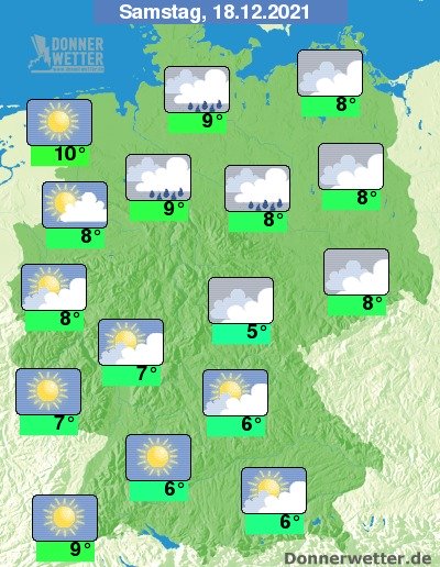 Am Samstag ist es überwiegend bedeckt oder trüb, vor allem im Süden, aber auch in den westlichen Landesteilen zeigen sich auch vielerorts Aufheiterungen. Im Norden sind einige Tropfen möglich, sonst bleibt es aber weitgehend trocken. Die Temperatur steigt auf 5 Grad in Erfurt und bis 10 Grad in Cuxhaven.