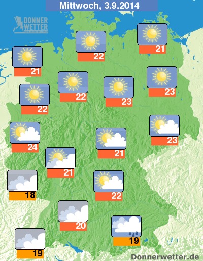 Der Mittwoch verspricht von der Mitte bis in den Norden ein sehr freundlicher Spätsommertag mit richtig viel Sonnenschein zu werden. Vor allem in der Nordhälfte stören kaum Wolken das herrliche Wetter. Im Süden, insbesondere in Alpennähe halten sich dagegen teils zähe Wolken aus denen es hin und wieder tröpfeln kann. Nennenswerte Niederschläge sind jedoch nicht zu erwarten. Die Temperaturspanne reicht von 18 Grad am Haardt bis 24 Grad im Rheinland.