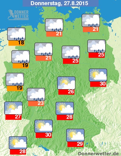 Am Donnerstag ziehen über die komplette Nordhälfte bis ins Rheinland über Regenwolken her, wodurch stärkere Regenfälle garantiert sind. Im Osten zeigt die Temperatur sich dennoch angenehm. Die Südhälfte Deutschlands zeigt wie in den vorherigen Tagen schon, ein heiteres sehr angenehmes Wetter mit hohen Temperaturen an.