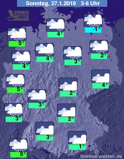 Am Sonntag ist es verbreitet stark und nur selten auch mal etwas aufgelockert bewölkt, dabei fällt zeitweise Regen, über der Osthälfte zum Teil auch Schneeregen oder Schnee. Die Temperatur steigt auf 2 Grad in Vorpommern und bis 7 Grad im Rhein-Main-Gebiet.
