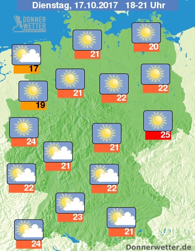 Heute Abend ist es über der Nordhälfte der Republik weitgehend nur sonnig, weiter nach Süden hin ziehen auch häufiger lockere Wolkenfelder durch, dabei bleibt es trocken. Die Temperatur liegt bei 17 Grad in Emden und bis 25 Grad in Dresden.