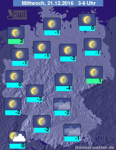 In der Nacht zum Mittwoch zeigt sich der Himmel über Deutschland weitestgehend sternenklar, vor allem im Süden kann sich gebietsweise Nebel oder Hochnebel bilden, dabei besteht Glättegefahr durch Rauhreifbildung! Es bleibt landesweit trocken bei Tiefstwerten von 2 Grad im nördlichen Emsland bis -4 Grad im Eichsfeld.