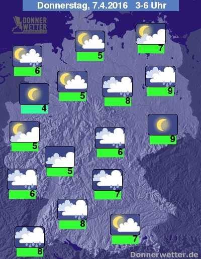 Am Donnerstag halten sich im Süden zumeist dichte Wolken, dazu fällt zeitweise Regen, in den anderen Landesteilen ist es zum Teil heiter bis sonnig, teilweise ziehen aber auch dichte Wolken durch, dabei sind einzelne Schauer möglich. Die Temperatur steigt auf 9 Grad in Mittelfranken und bis 13 Grad in der Lausitz.