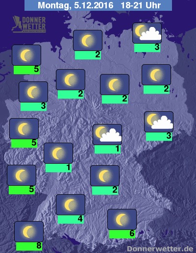 Heute Abend zeigt sich der Himmel über dem Land zum weitaus größten Teil sternenklar. Im Nordosten, sowie über Thüringen und Sachsen ziehen oft auch einige, meist lockere Wolken durch, dabei bleibt es trocken. Die Temperatur liegt bei Werten zwischen 1 und 8 Grad.