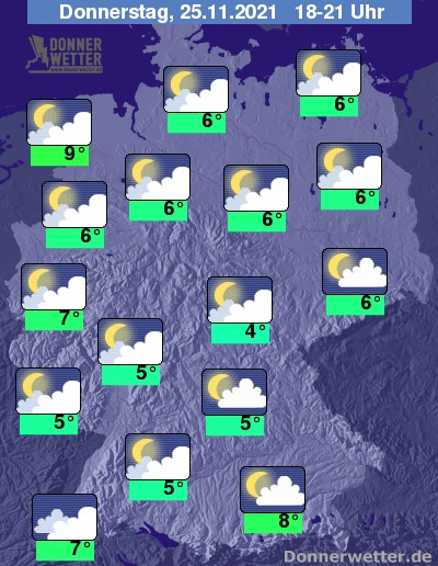 Heute Abend zieht teils starke, teils auch aufgelockerte Bewölkung durch, dabei bleibt es bis auf seltene Schauer im Bereich der Küsten trocken. Die Temperatur liegt bei 4 Grad in Jena und 9 Grad in Cuxhaven.